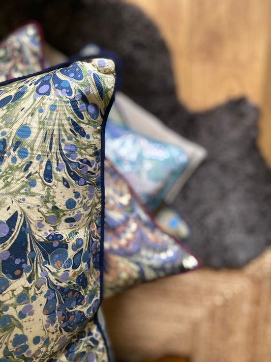 In Stock: Linen Marbled Cushion - Juniper Neptune & Ditzy Blue Daze