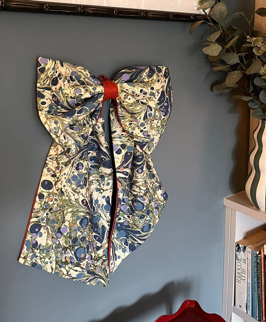 Our statement marbled bows use remnant / end of line linen mix fabrics on the reverse, sourced locally and made each time in limited batch runs. As such, the reverse fabric used will vary from batch to batch, making each bow truly unique!