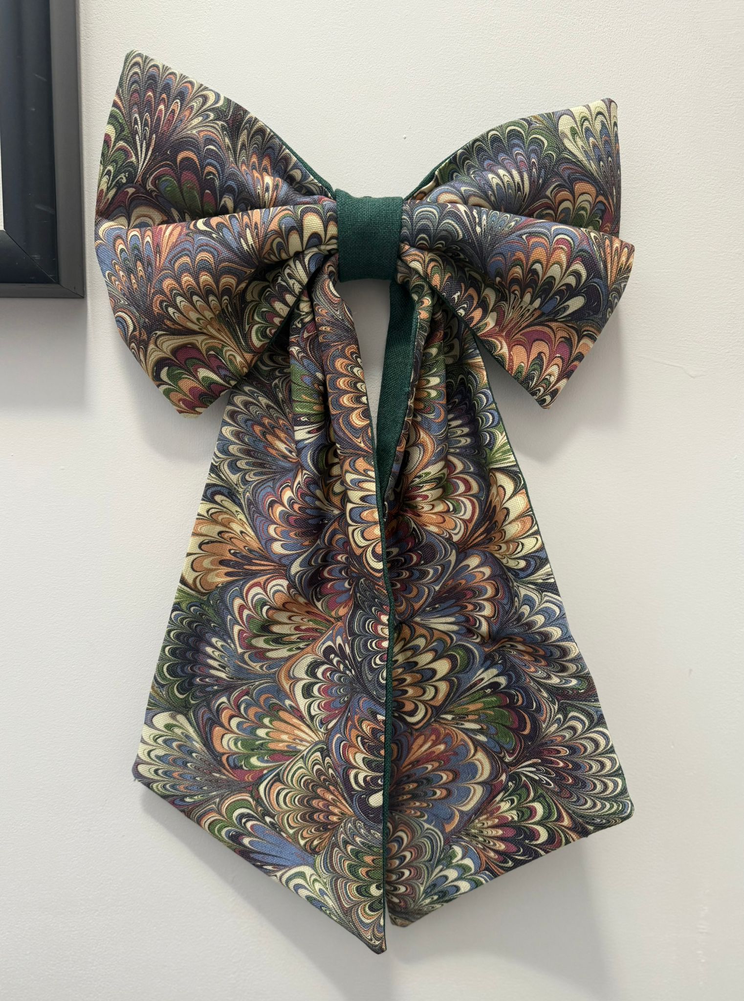 Green remnant end of line fabric has been used for the reverse of each bow and the centre loop, as such the backing fabric & centre loop may vary.